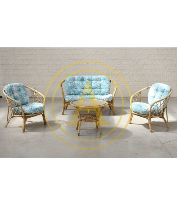 Composé d’un canapé, de deux fauteuils et d’une table basse. Coussins volants sur les assises et les dossiers.