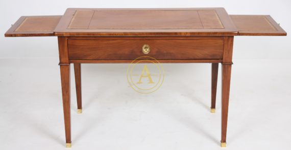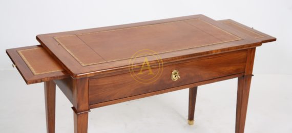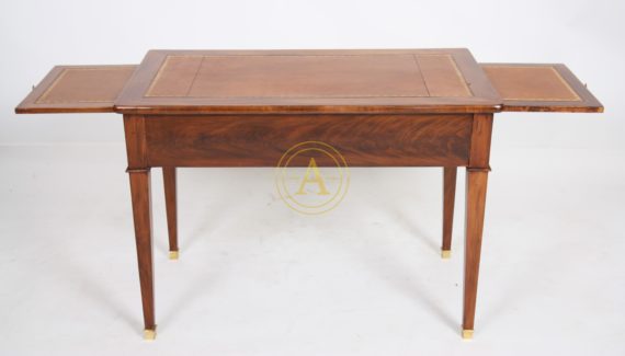 Mahogany and mahogany veneer, opening to a large drawer belt and two side zippers wrapped in fawn leather, resting on four feet sheaths, tawny leather uppers.