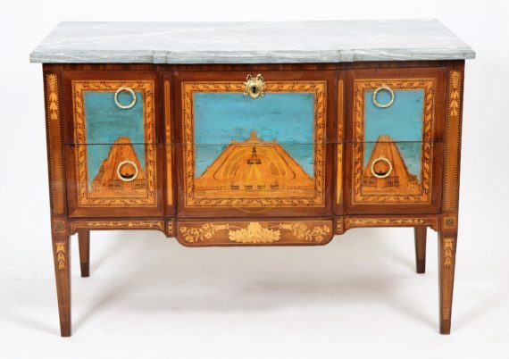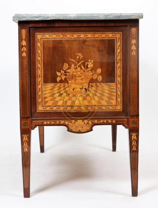 So-called “sauteuse” form commode, with central “ressaut”, opening in the front with two drawers without crossbars, flat sides, and resting on four section legs. In the front, a very nice perspective decoration of a garden park, surrounded by a frame and wrapped in marquetry. On the sides, a flower marquetry perspective decoration also framed and wrapped with a decor. Blue turquin marble top.